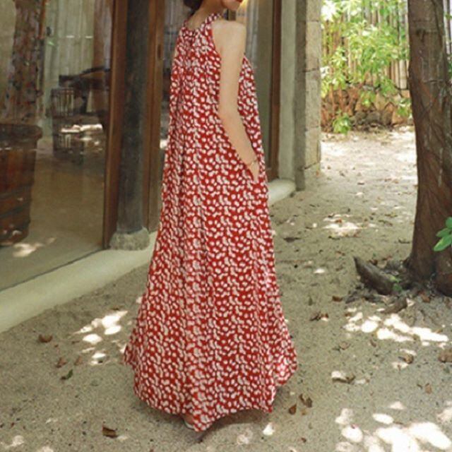 スーパーフレアタイプなのでマキシワンピにも見え、デコルテの肌見せがスタイルアップ効果も♪
